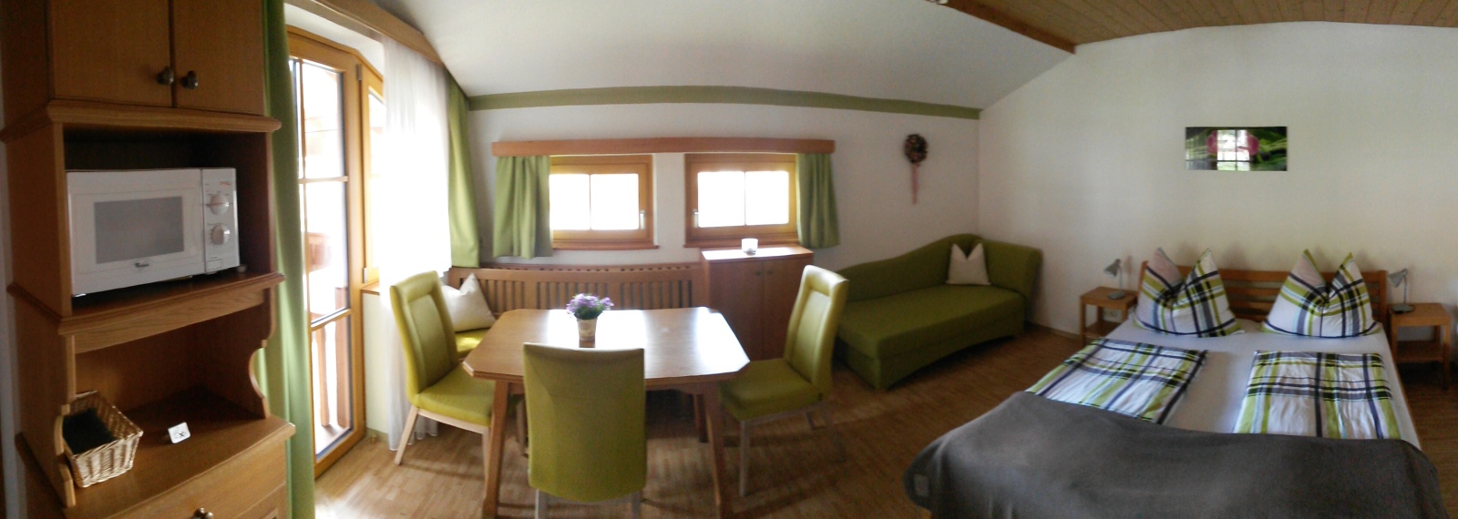 Unser freundliches, südwestseitig gelegenes Appartement besteht aus einem großen Wohn-Schlafraum mit Doppelbett, Couch (als Zusatzbett verwendbar), gemütlicher Sitzecke, einem kleinen Schlafzimmer mit zwei Einzelbetten, Kochnische, Dusche/WC und großem Balkon.